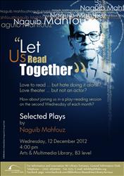 The Reference Services Section is holding its monthly play reading in English on Wednesday, 12 December 2012. Participants will read Selected Plays by Naguib Mahfouz.