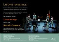 The BA Reference Services Section and the Francophone Library are holding the monthly play reading in French on Wednesday, 4 December 2013. Participants will read Le mensonge (The Lie) by Nathalie Sarraute.