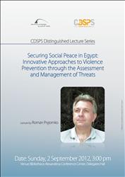 Dans le cadre de sa série de conférences remarquables, le Centre des Etudes de la Démocratie et de la Paix Sociale (CDSPS) de la BA organise, le Dimanche 2 septembre 21012, un séminaire intitulé « Garantir la Paix Sociale en Egypte : Approches Novatrices de Prévention de Violence par l’Evaluation et la Gestion des Risques ».