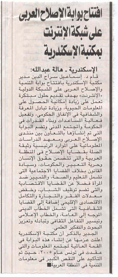 The website was officially launched on 16 November 2005 during the World Summit for Information Society (WSIS) Tunis phase with messages from Mr. Kofi Annan – UN Secretary General at the time, Dr. Tarek Kamel – Egypt's Minister of Communication and Information Technology, and Dr. Ismail Serageldin – BA Director.