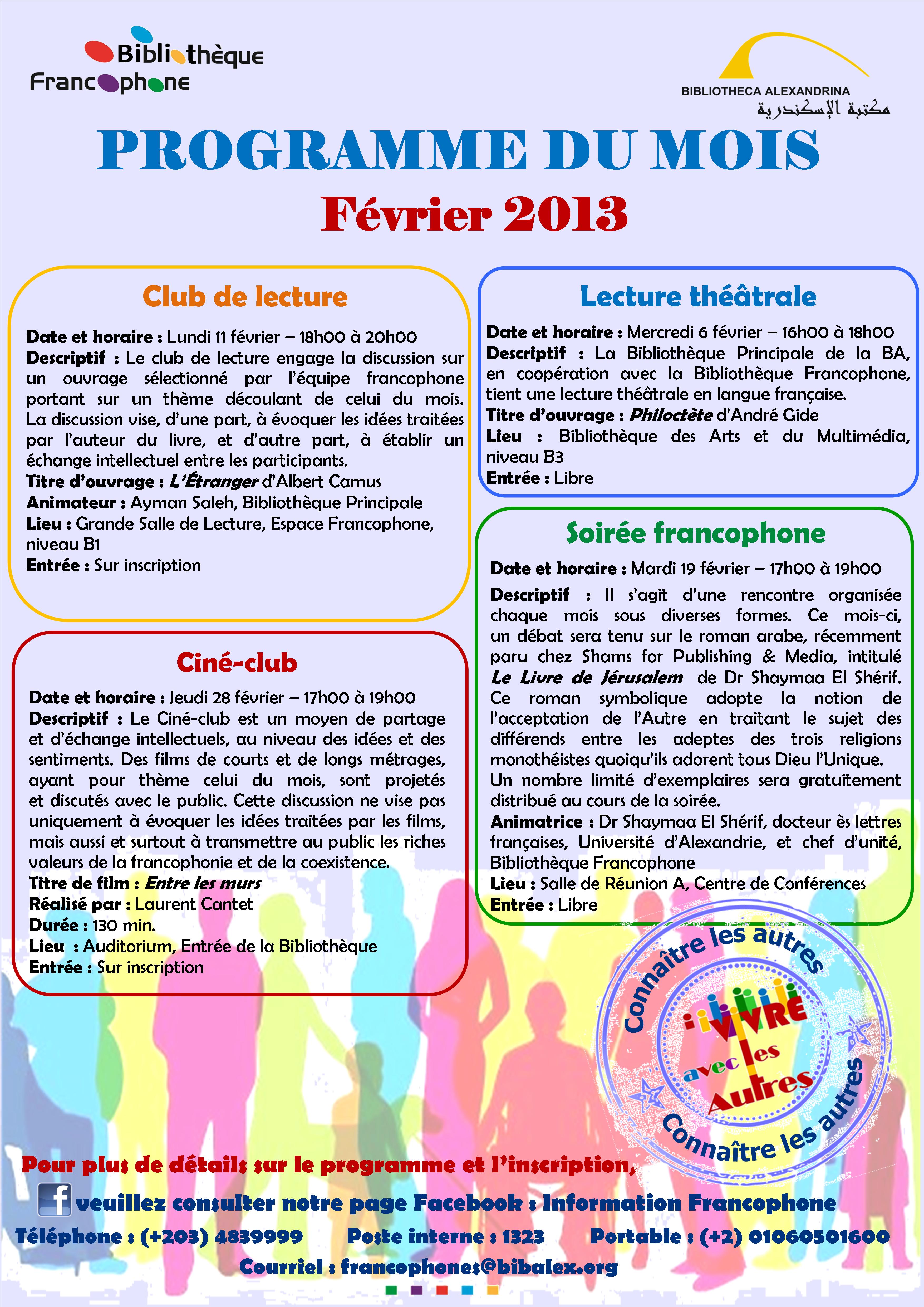 Programme du mois de février de la Bibliothèque Francophone