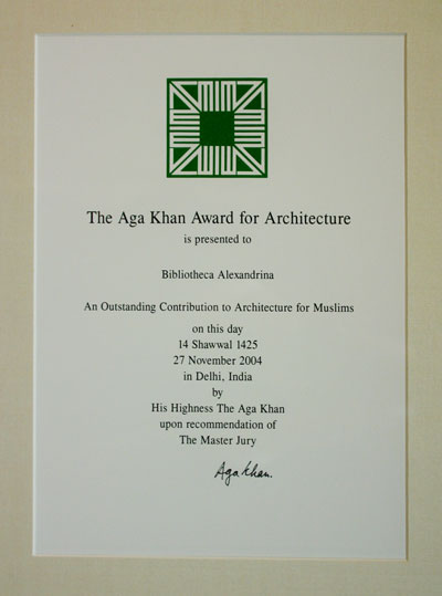 La Bibliotheca Alexandrina a fêté mardi 23 décembre 2004 afin d’honorer ceux qui ont participé à la réalisation de ce grand projet architectural qu’est la Bibliothèque d’Alexandrie la réception du prix Aga Khan pour l’architecture. La Bibliothèque a été choisie parmi sept autres réalisations retenues. Dr. Ismaël Sarageldin, directeur de la Bibliotheca Alexandrina, a prononcé un message de bienvenue ainsi qu’une allocution détaillée où il a fait une peinture du prix depuis sa création en 1977 ainsi que des ouvrages qui ont été primés. Dr. Sarageldin a porté une attention particulière au neuvième cycle pour la période 2002-2004 durant lequel la Bibliothèque a été récompensée. Certaines des plus importantes figures d’Alexandrie ont été conviées pour être à leur tour honorées par la BA, ainsi Abd Al-Salam Al-Mahgoub, gouverneur de la ville d’Alexandrie, Dr. Mohsen Moharam Zahran, directeur du projet de construction de la Bibliothèque et professeur d’architecture à l’Université d’Alexandrie et Mr. Mohamed Al-Dakroury, membre du Conseil d’Etat et le parlementaire qui fut en charge de suivre la progression des travaux lors de la construction.